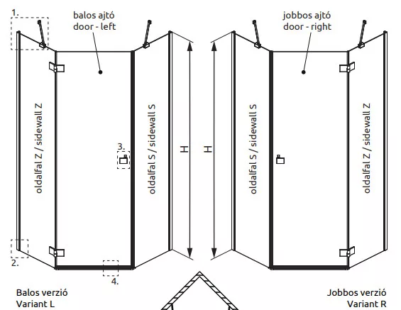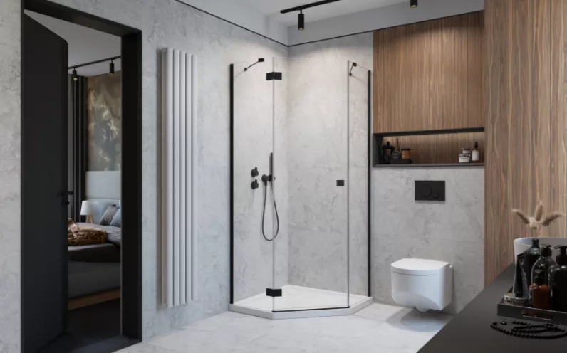 Ötszögletű fekete zuhanykabin két fix résszel, kifelé nyíló ajtóval.