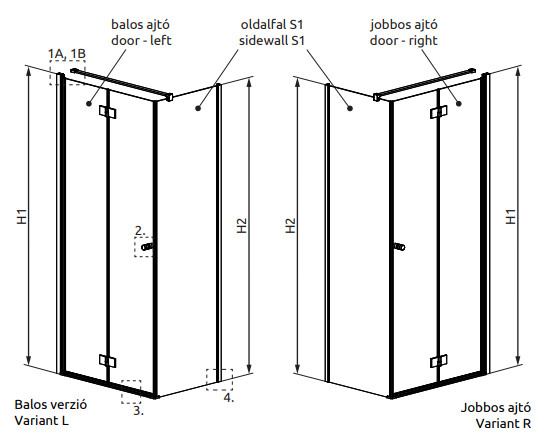 Szögletes zuhanykabin kifelé nyíló csuklós ajtóval.