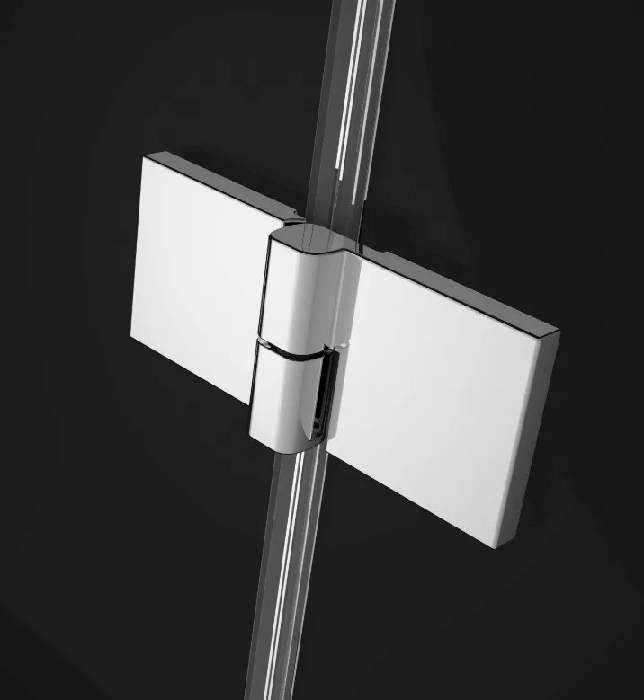 Szögletes zuhanykabin kifelé nyíló ajtóval és egy fix oldalfallal.