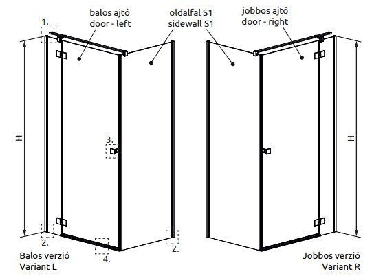 Szögletes zuhanykabin kifelé nyíló ajtóval és egy fix oldalfallal.