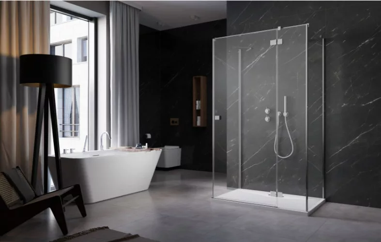 Szögletes zuhanykabin kifelé nyíló ajtóval és egy fix oldalfallal.