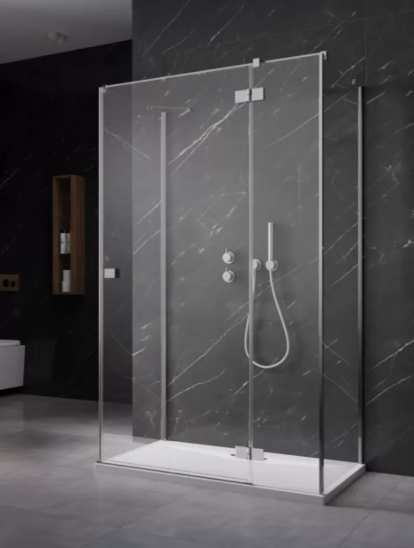 Szögletes zuhanykabin kifelé nyíló ajtóval és egy fix oldalfallal.