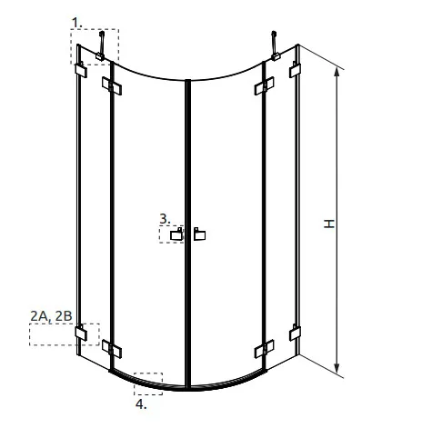 Kifelé nyíló íves zuhanykabin oldalanként fix résszel.