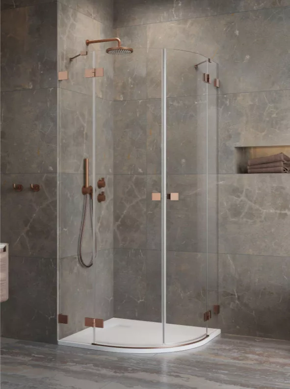 Íves zuhanykabin kifelé nyíló ajtókkal, oldalanként fix résszel, szálcsiszolt réz kivitel.