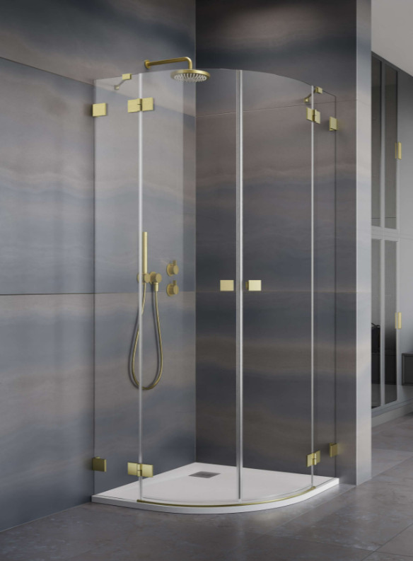 Íves zuhanykabin kifelé nyíló ajtókkal, oldalanként fix résszel, szálcsiszolt arany kivitel.