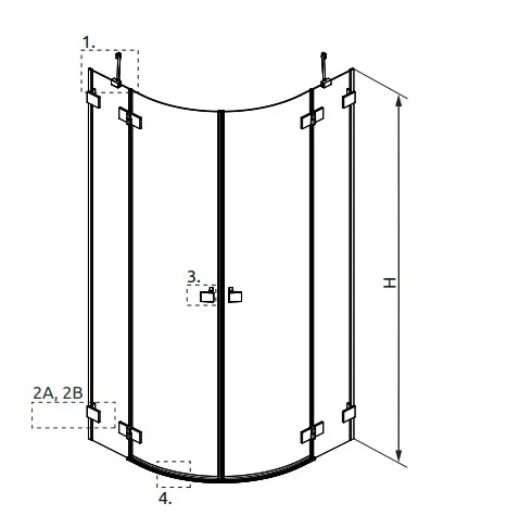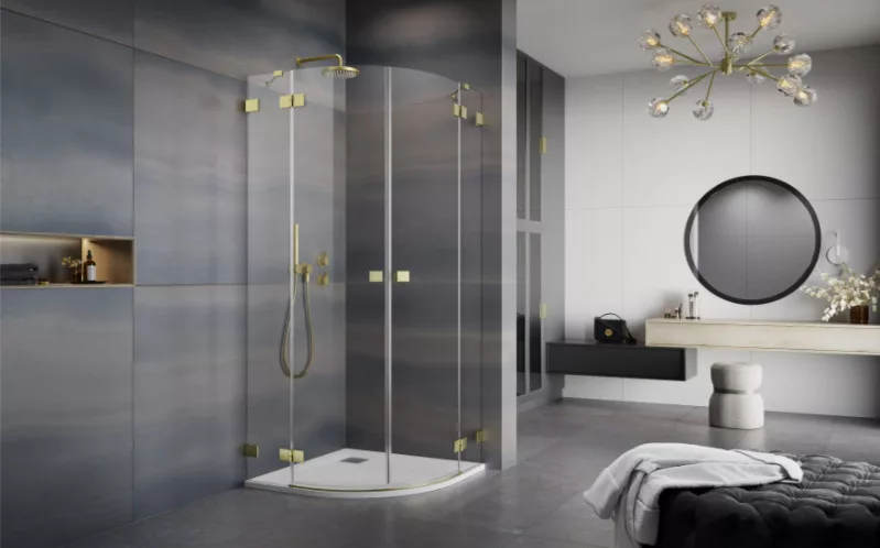 Íves zuhanykabin kifelé nyíló ajtókkal, oldalanként fix résszel, szálcsiszolt arany kivitel.