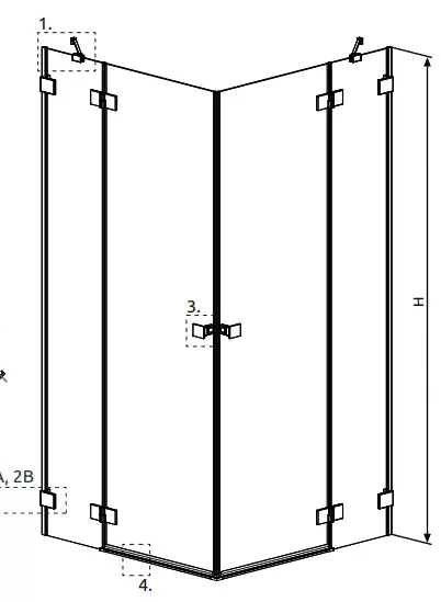Szögletes zuhanykabin két fix résszel és kifelé nyíló ajtóval, szálcsiszolt fegyvermetál kivitel.