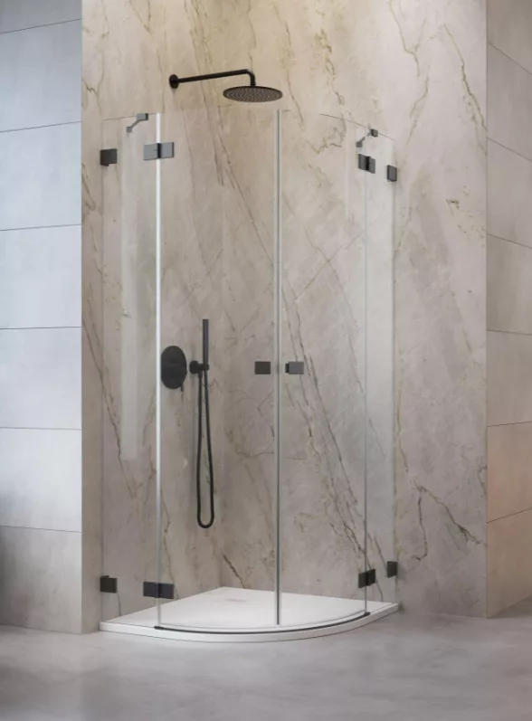 Íves zuhanykabin kifelé nyíló ajtókkal, oldalanként fix résszel, szálcsiszolt fegyvermetál kivitel.