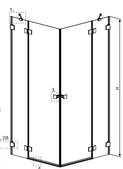 Szögletes zuhanykabin két fix résszel és kifelé nyíló ajtóval, szálcsiszolt króm kivitel.