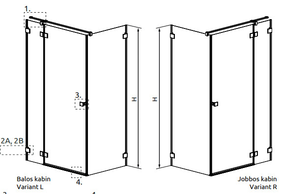 Szögletes zuhanykabin kifelé nyíló ajtóval és egy fix oldalfallal, szálcsiszolt króm kivitel.