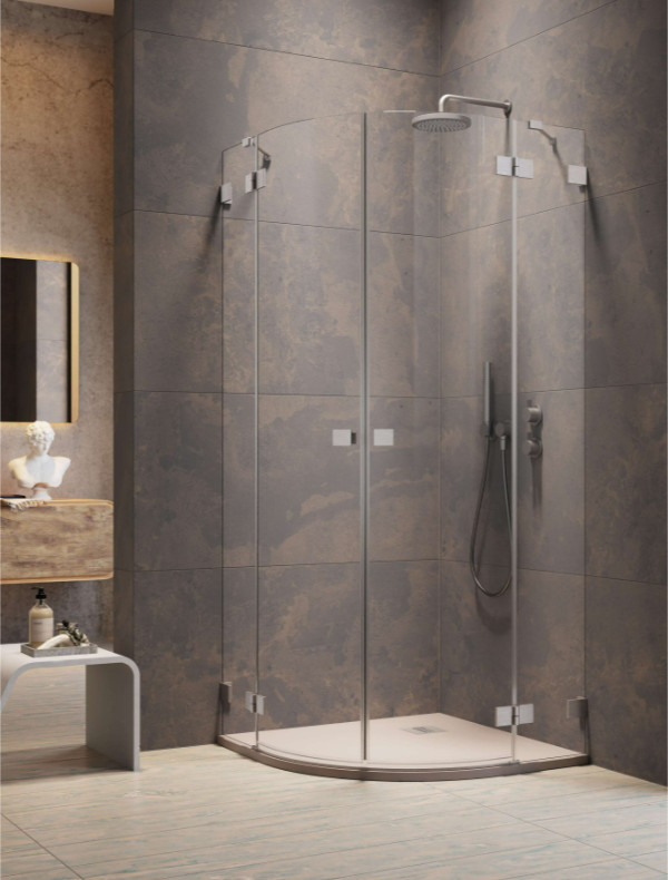 Íves zuhanykabin kifelé nyíló ajtókkal, oldalanként fix résszel, szálcsiszolt króm kivitel.