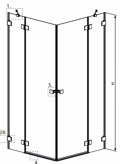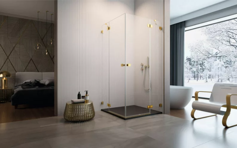 Szögletes arany zuhanykabin két fix résszel, kifelé nyíló ajtóval.