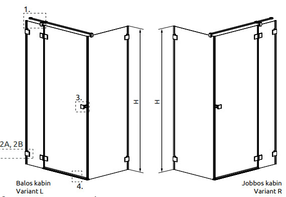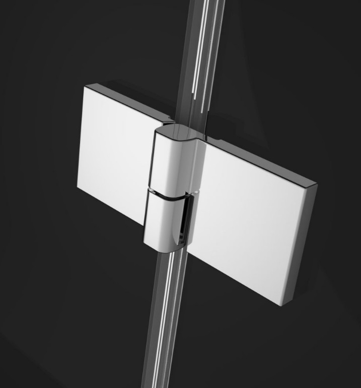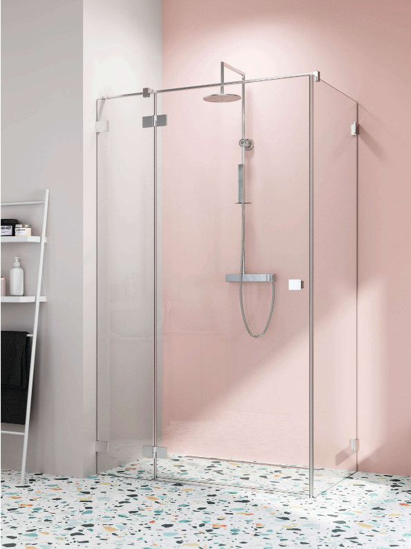 Szögletes zuhanykabin kifelé nyíló ajtóval és egy fix oldalfallal.
