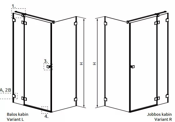 Szögletes fehér zuhanykabin kifelé nyíló ajtóval és egy fix oldalfallal.