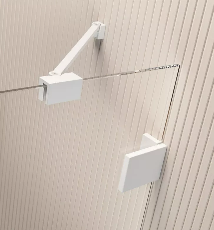 Szögletes fehér zuhanykabin kifelé nyíló ajtóval és egy fix oldalfallal.
