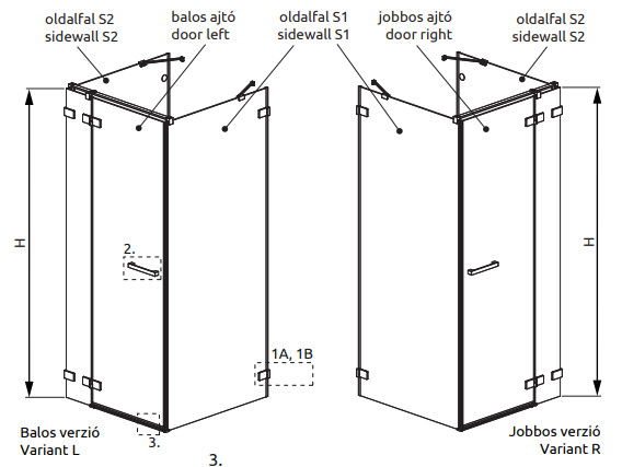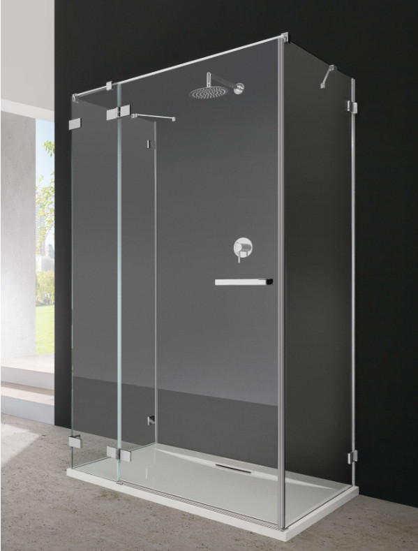 Egyenes falra építhető, háromoldalú kifelé nyíló szögletes zuhanykabin két fix és egy nyíló oldallal.