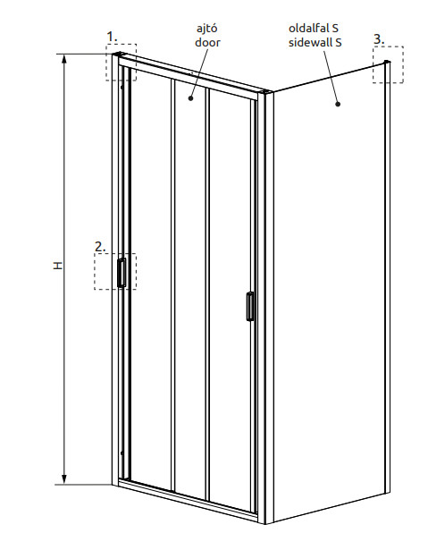 Görgős zuhanykabin hármas tagolású, mindkét oldalról nyitható ajtókkal és egy fix oldalfallal.