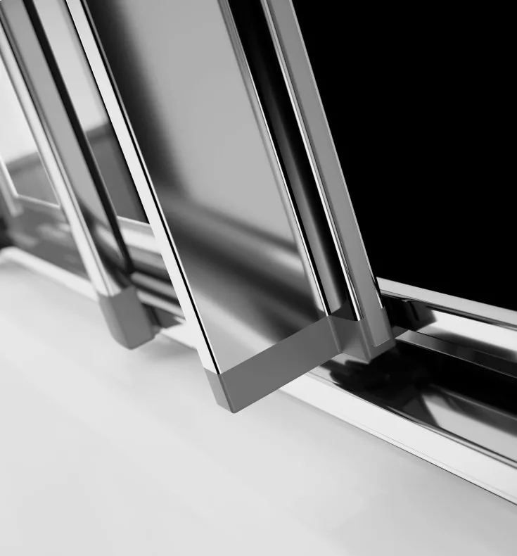 Görgős zuhanykabin hármas tagolású, mindkét oldalról nyitható ajtókkal és egy fix oldalfallal.