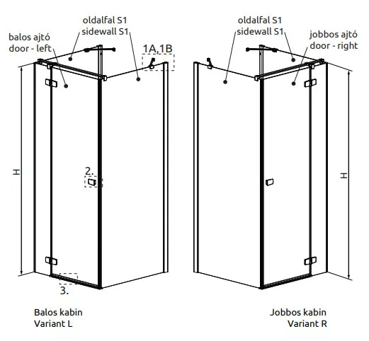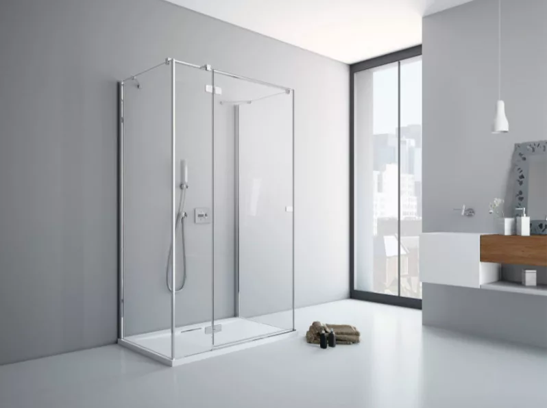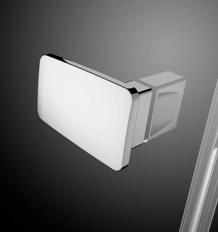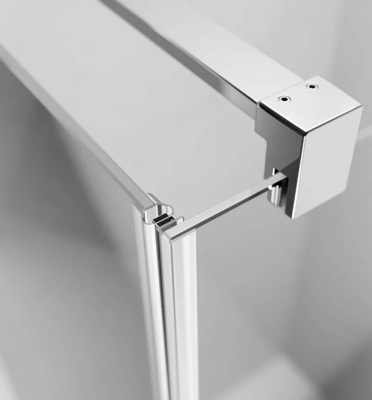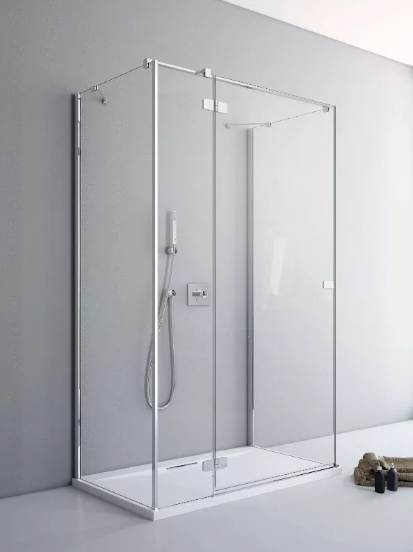 Egyenes falra építhető, háromoldalú kifelé nyíló szögletes zuhanykabin két fix és egy nyíló oldallal.