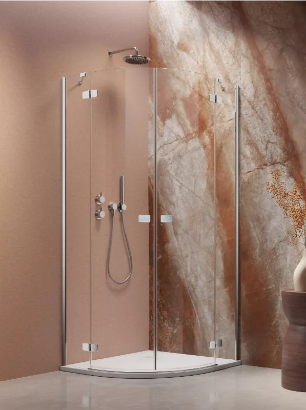 Kifelé nyíló íves zuhanykabin dupla ajtókkal és fix résszel