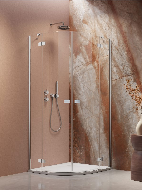 Kifelé nyíló íves zuhanykabin dupla ajtókkal és fix résszel.