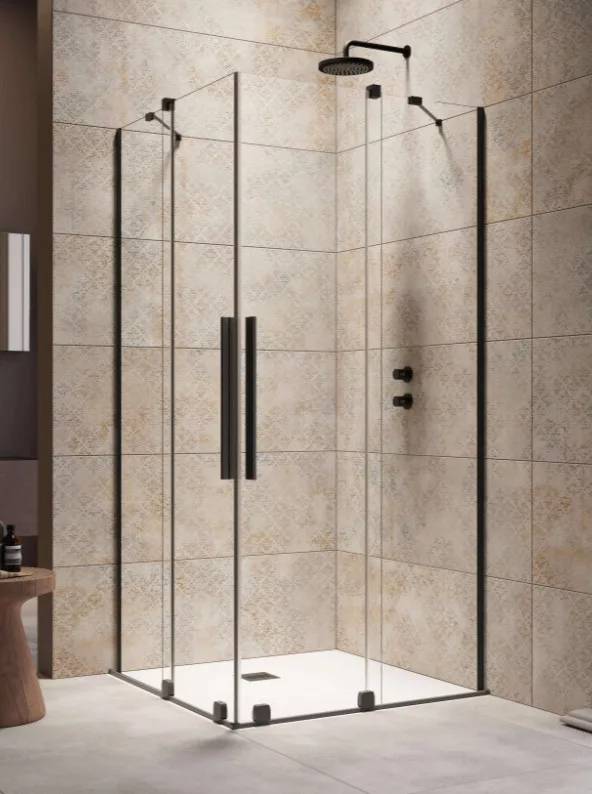 Szögletes fekete zuhanykabin dupla, alsógörgős ajtókkal.