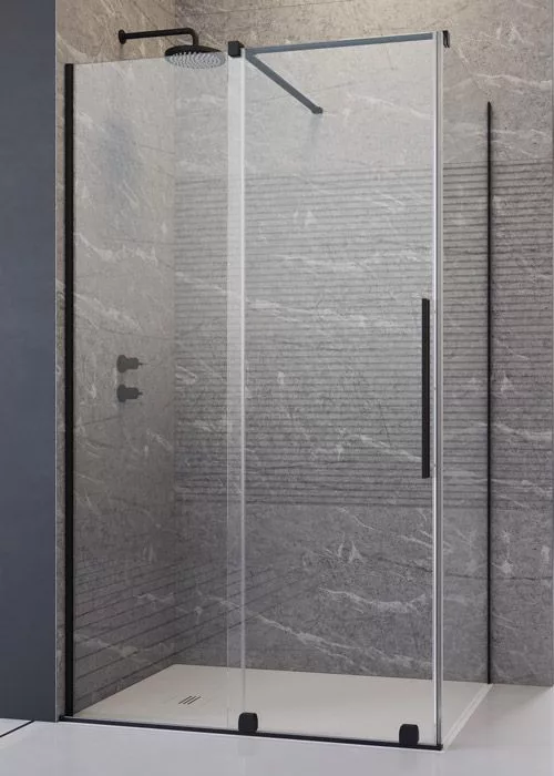 Szögletes zuhanykabin egy fix és egy alsógörgős ajtóval, fekete változat.