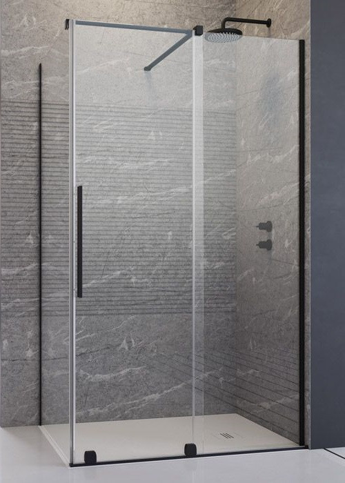 Szögletes zuhanykabin egy fix és egy alsógörgős ajtóval, fekete változat.