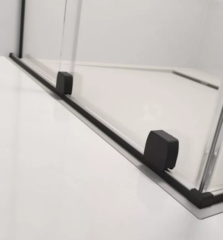 Szögletes fekete zuhanykabin egy fix és egy alsógörgős ajtóval.