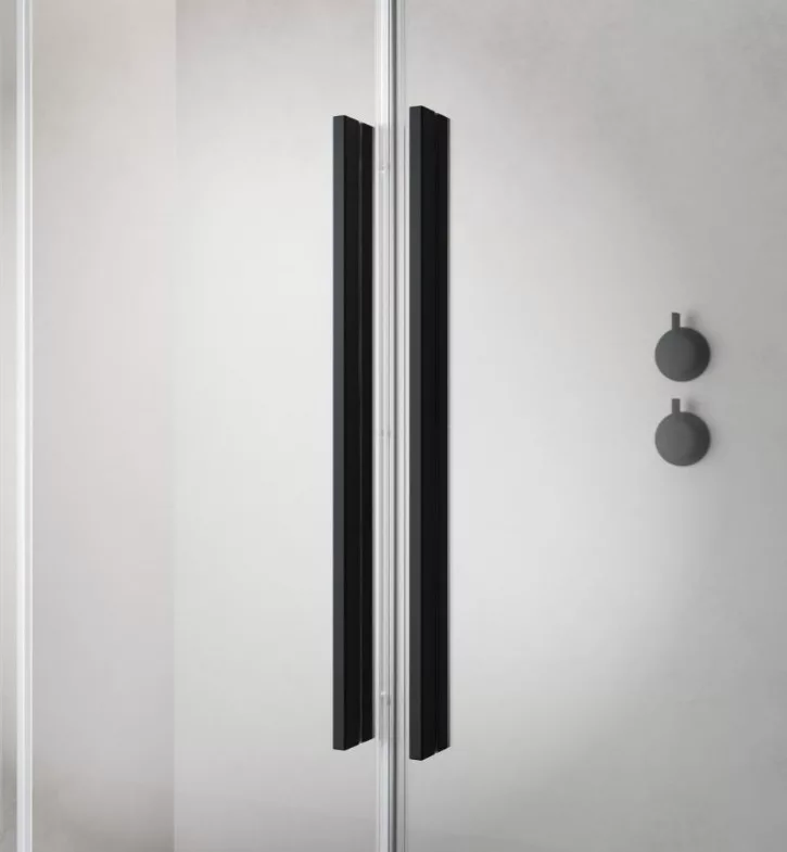 Szögletes fekete zuhanykabin egy fix és egy alsógörgős ajtóval.