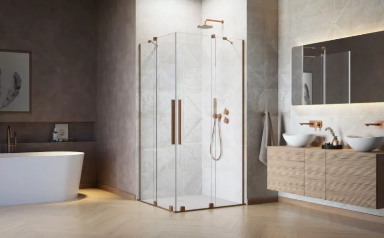 Szögletes zuhanykabin dupla, alsógörgős ajtókkal, szálcsiszolt réz változat.Méret: 80x110 cm