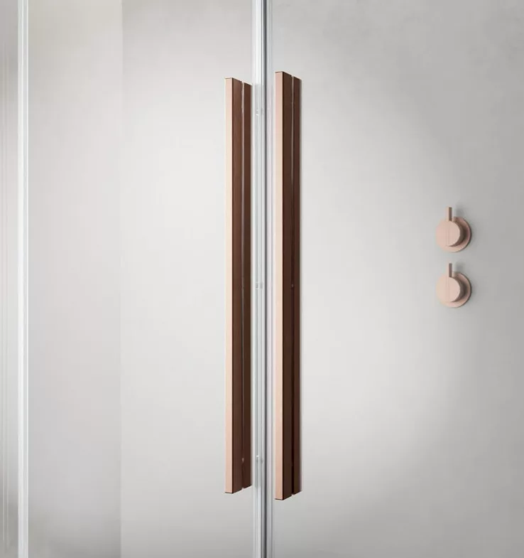 Szögletes zuhanykabin egy fix és egy alsógörgős ajtóval, szálcsiszolt réz változat.