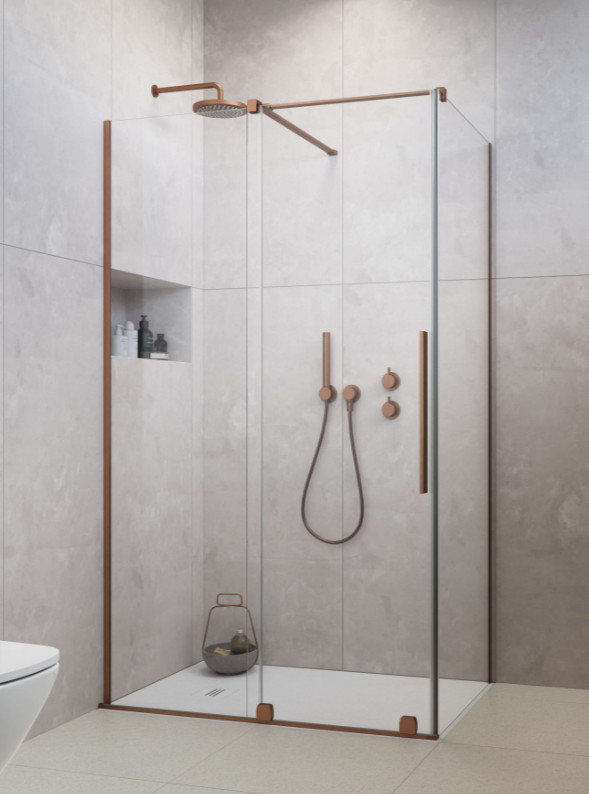 Szögletes zuhanykabin egy fix és egy alsógörgős ajtóval, szálcsiszolt réz változat.