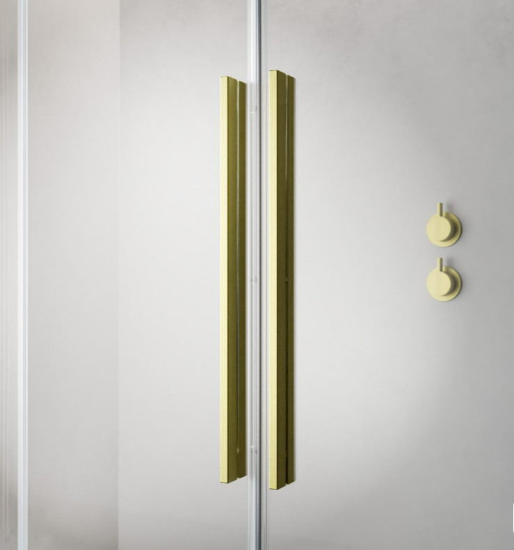 Szögletes zuhanykabin dupla, alsógörgős ajtókkal, szálcsiszolt arany változat.