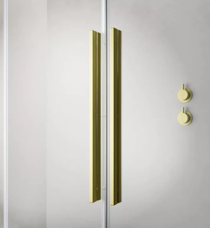 Szögletes zuhanykabin egy fix és egy alsógörgős ajtóval, szálcsiszolt arany változat.