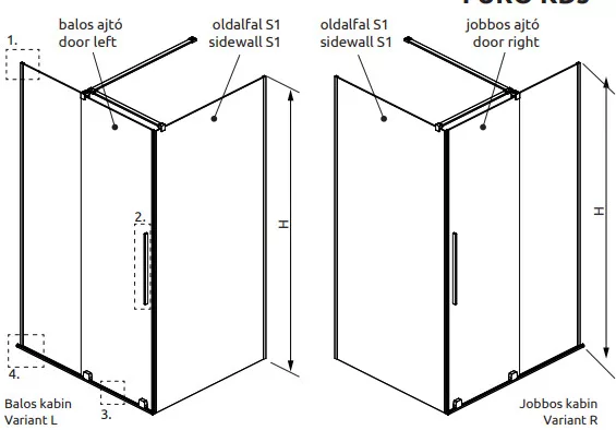 Szögletes zuhanykabin egy fix és egy alsógörgős ajtóval, szálcsiszolt fegyvermetál változat.