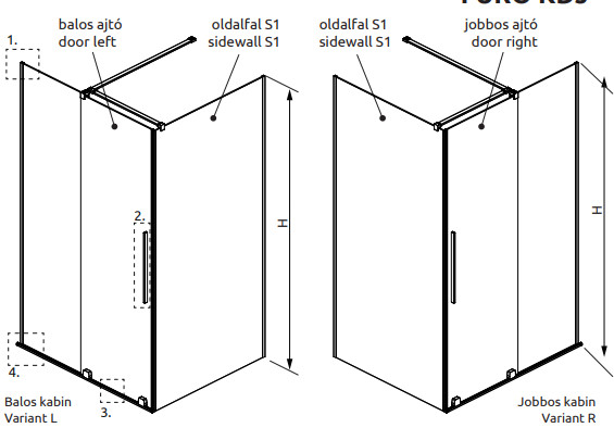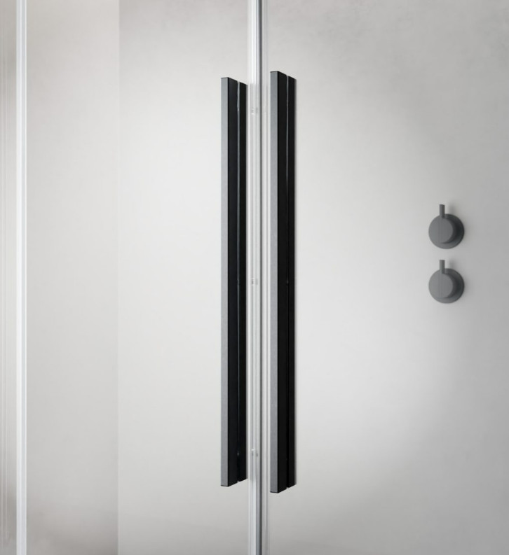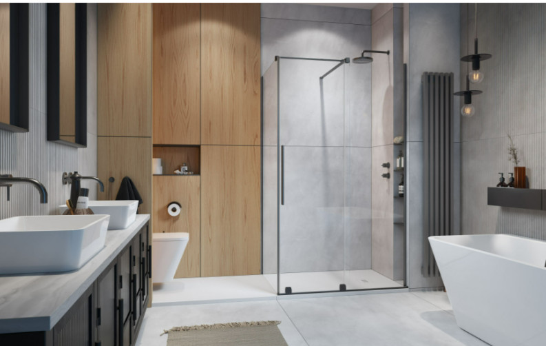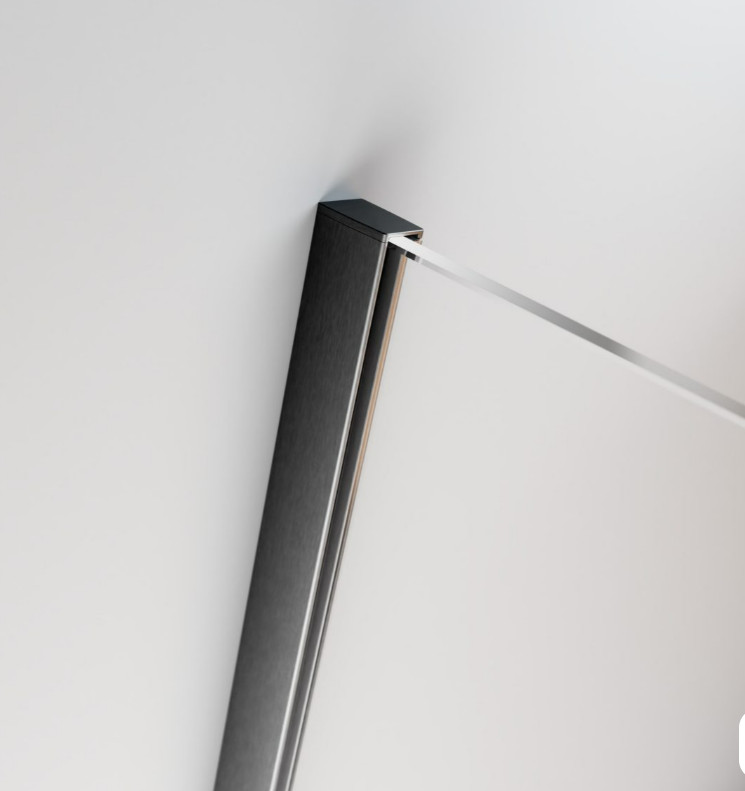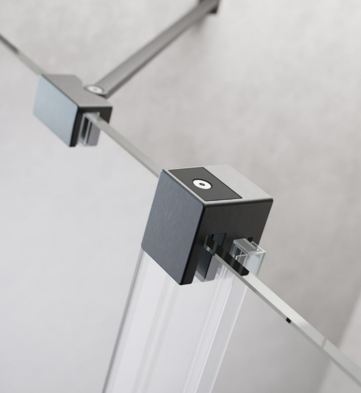 Szögletes zuhanykabin egy fix és egy alsógörgős ajtóval, szálcsiszolt fegyvermetál változat.