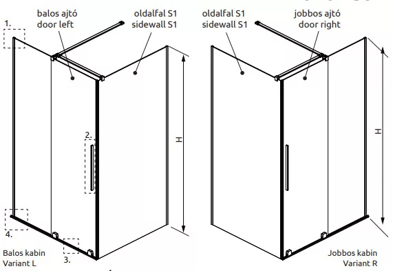 Szögletes zuhanykabin egy fix és egy alsógörgős ajtóval, szálcsiszolt króm változat.