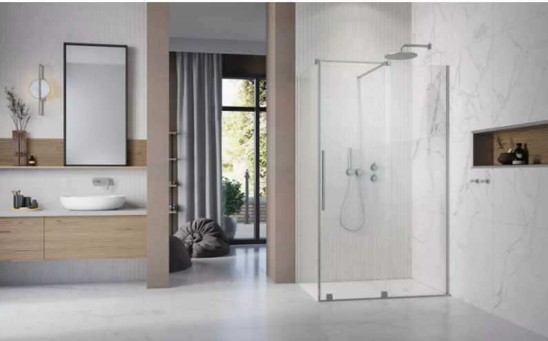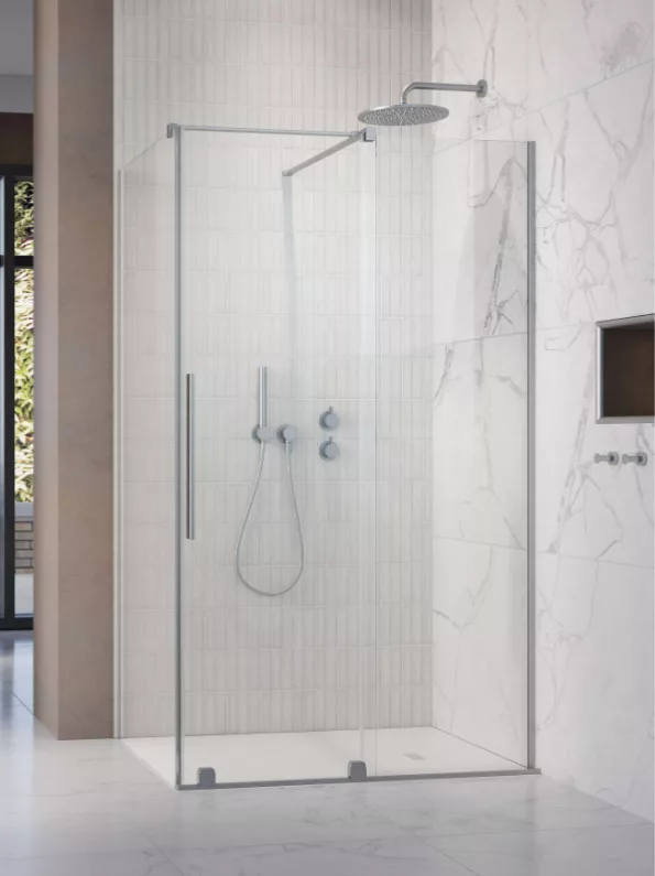 Szögletes zuhanykabin egy fix és egy alsógörgős ajtóval, szálcsiszolt króm változat.