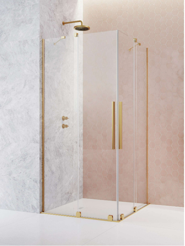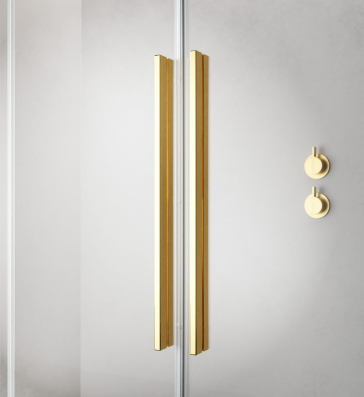 Szögletes arany zuhanykabin dupla, alsógörgős ajtókkal.