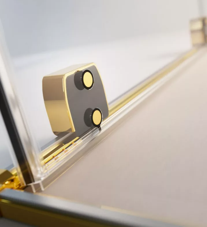 Szögletes arany zuhanykabin egy fix és egy alsógörgős ajtóval.