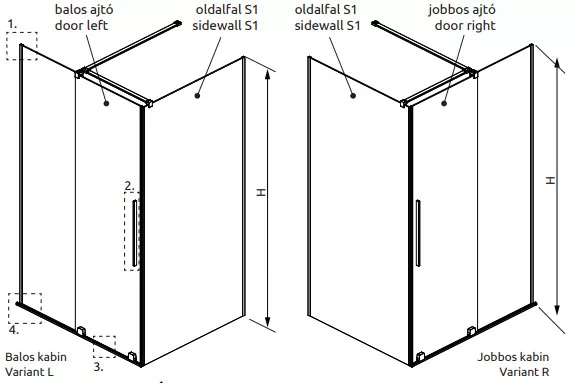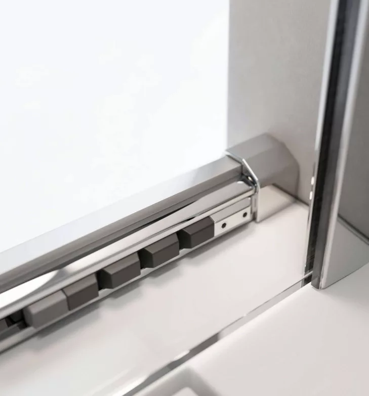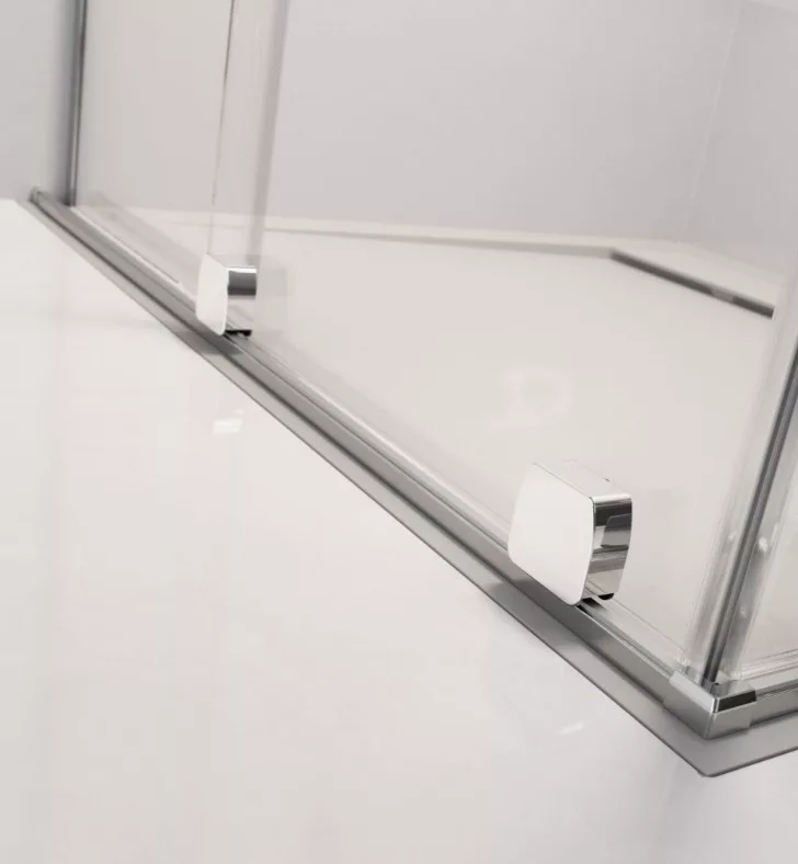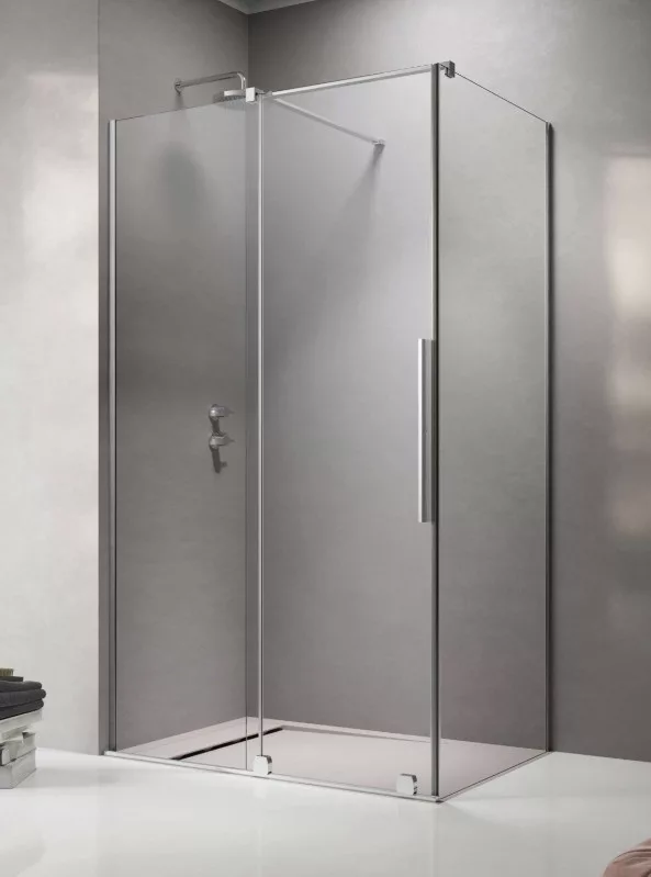Szögletes zuhanykabin egy fixfallal és egy alsógörgős ajtóval.