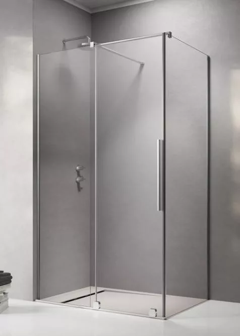 Szögletes zuhanykabin egy fix és egy alsógörgős ajtóval, króm változat.