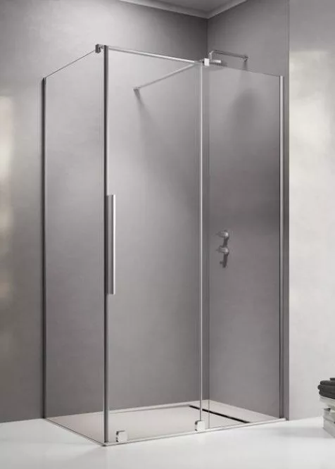Szögletes zuhanykabin egy fix és egy alsógörgős ajtóval, króm változat.