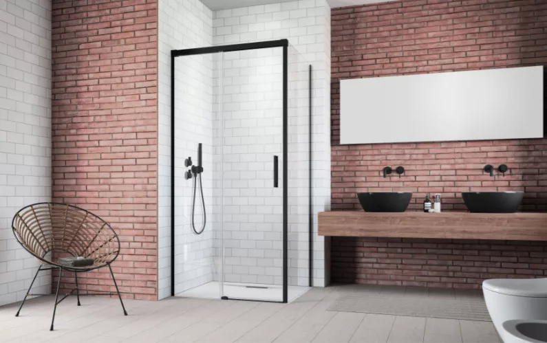 Szögletes fekete zuhanykabin egy görgős ajtóval és egy fix oldalfallal.