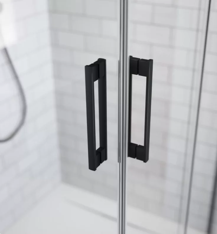 Szögletes fekete zuhanykabin egy görgős ajtóval és egy fix oldalfallal.