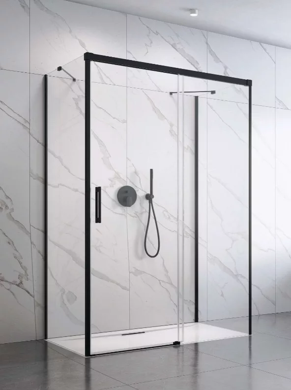 Egyenes falra építhető, háromoldalú szögletes fekete zuhanykabin két fixfallal és egy görgős ajtóval.