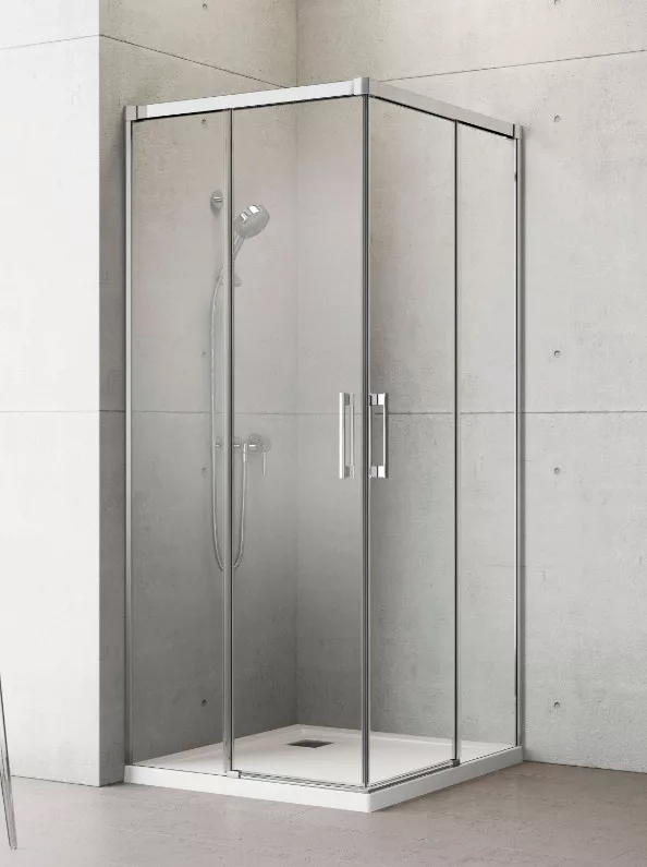 Szögletes zuhanykabin görgős dupla ajtóval, fix résszel.
