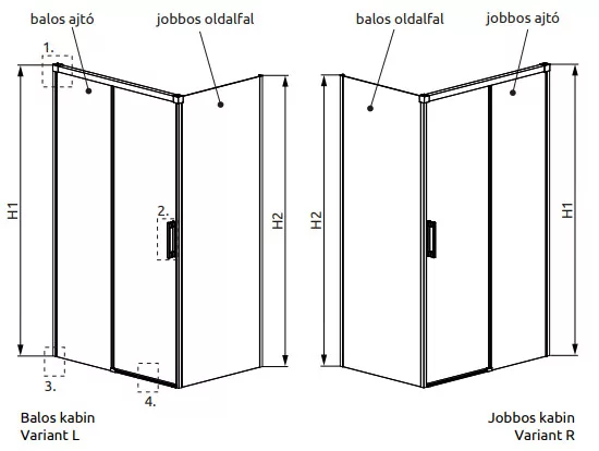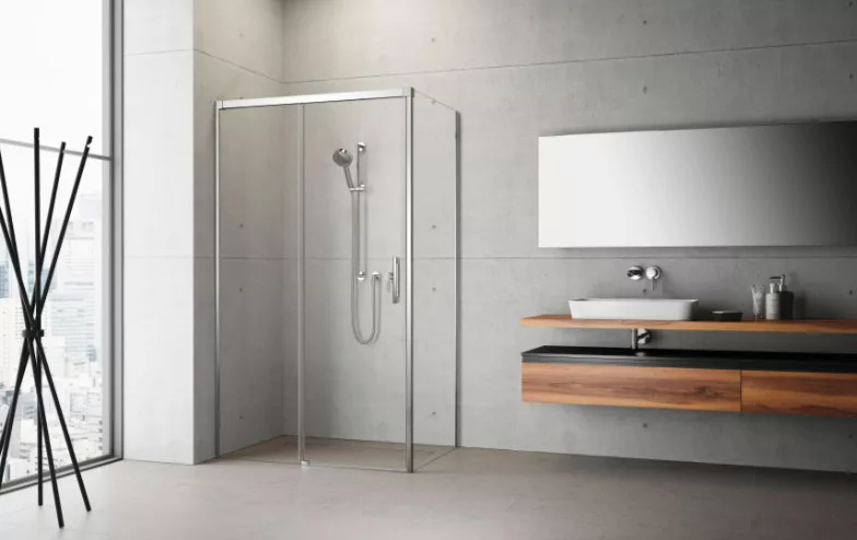Szögletes zuhanykabin egy görgős ajtóval és egy fix oldalfallal.