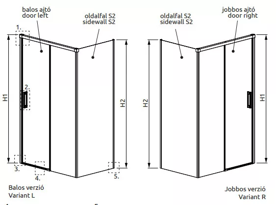 Szögletes zuhanykabin egy görgős ajtóval és egy fix oldalfallal.